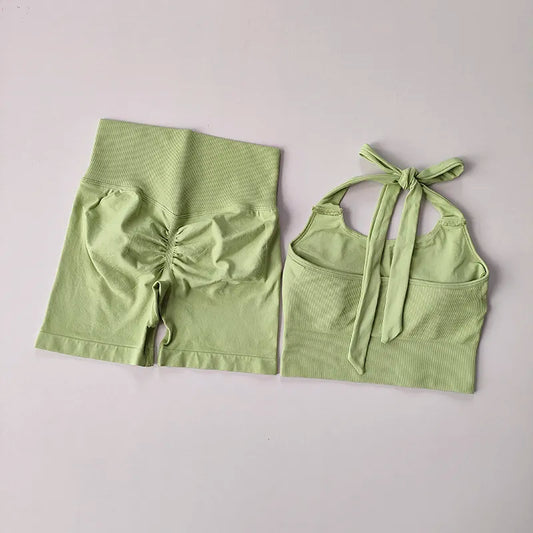 Peach Hip Lifting Suit Neck Hanging Sports Bra Shockproof Gathering Bra Quick Drying Short Set Gym Fitness Running Yoga Suit